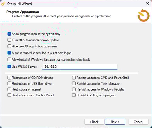 Found in the Deployment Tools folder, the Setup INI Wizard tool allows IT Administrators to preset their installation package for deployment across many workstations while retaining an identical configuration to the REboot REstore client. This includes configuring the address of your WSUS Server on the Program Appearance screen during the onboarding steps: