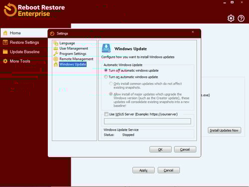 The Reboot Restore client can be configured to scan and download Windows Updates direclty from Microsoft's servers or via your internal Windows Server Update Services (WSUS). Follow the steps below on how to configure the Reboot Restore client to use your WSUS server .